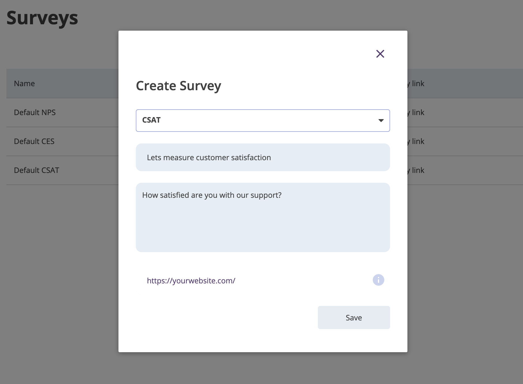 - Then few items about what you want to collect (in this example we’ve used the CSAT as the survey type of interest):