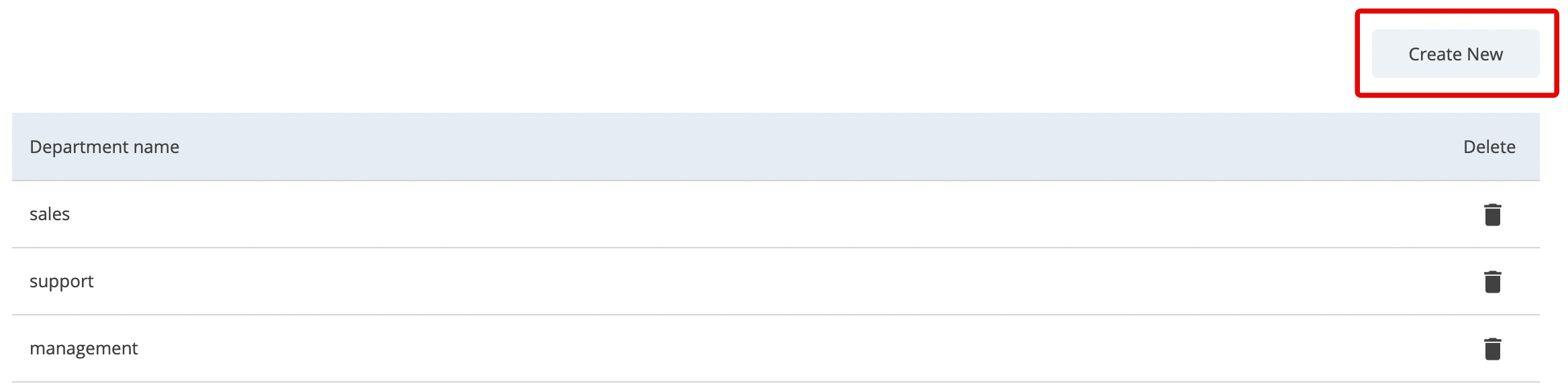 - On the top right corner of the departments, list click on Create New.